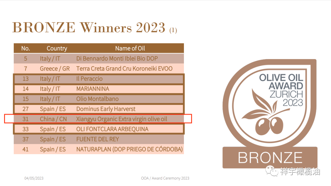 祥宇選送的特級初榨橄欖油在10個國家126個樣品中獲得1銀1銅的好成績。